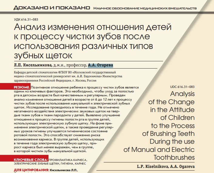 Основным средством ухода за полостью рта в домашних условиях является зубная щетка. Многими исследованиями доказано, что электрические щетки более эффективно удаляют налет, чем мануальные [1, 3, 13]. В последнее время все чаще появляются разработанные специально для детей электрические устройства для чистки зубов, которые учитывают не только физиологические, но и психологические особенности развития ребенка. Отличительной чертой современных детских электрических зубных щеток является их яркий дизайн. Они привлекают внимание ребенка, повышают его интерес к процессу чистки зубов и, следовательно, способствует улучшению качества ежедневной гигиены полости рта [2]. Поэтому выбор индивидуальных средств гигиены ротовой полости — один из важнейших аспектов профилактики кариеса в детском возрасте [6].