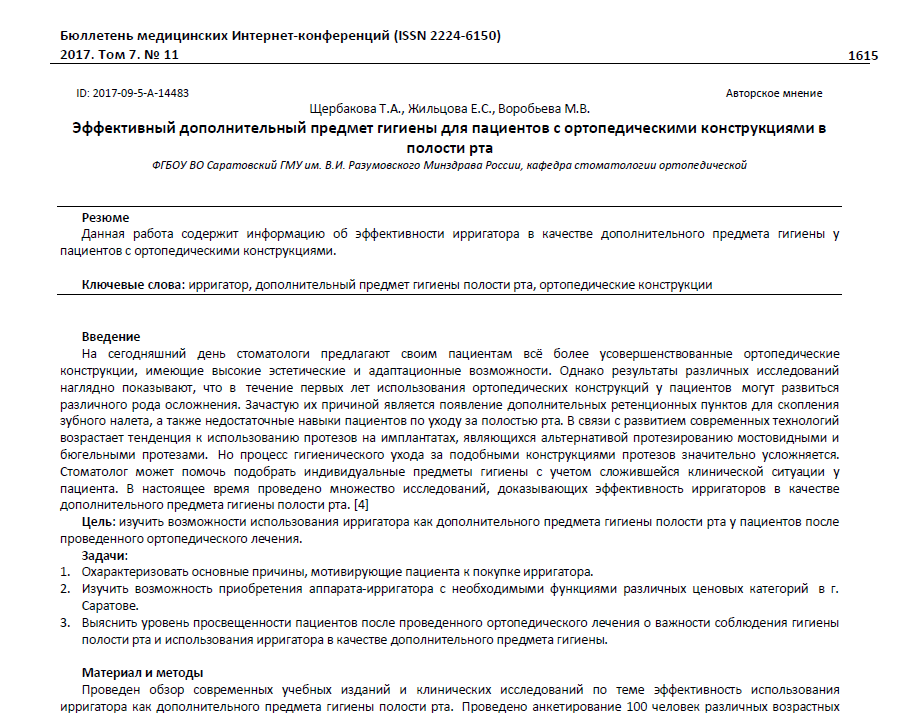 Проведен обзор современных учебных изданий и клинических исследований по теме эффективность использованияирригатора как дополнительного предмета гигиены полости рта. Проведено анкетирование 100 человек различных возрастныхгрупп, целью которого было выяснение уровня осведомленности пациентов с ортопедическими конструкциями о важностисоблюдения гигиены полости рта и их знакомство с ирригатором, как дополнительным предметом гигиены. Критерием включенияв наше исследование было наличие в полости рта пациента любой ортопедической конструкции.