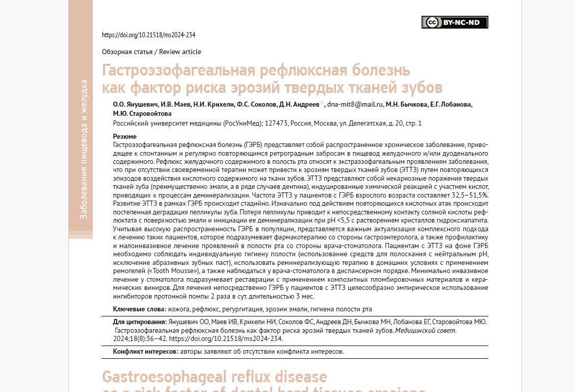 Гастроэзофагеальная рефлюксная болезнь как фактор риска эрозий твердых тканей зубов