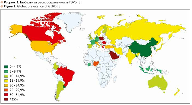 а заболеваемость имеет неуклонную тенденцию к росту во всех регионах мира [6, 7]. Согласно последнему метаанализу J.S. Nirwan et al. 2020 г., обобщившему результаты 102 исследований, глобальная распространенность ГЭРБ составляет 13,98% (95% ДИ 12,47–15,56%) [8]. Таким образом, около 1,03 млрд человек во всем мире страдают от этого заболевания (рис. 1). При этом наиболее высокая частота ГЭРБ отмечается в странах Северной Америки (19,55%, 95% ДИ 15,60–23,83), а низкая – в странах Азии (12,92%, 95% ДИ 10,51–15,53) [8]. Согласно ранним работам, в России распространенность ГЭРБ варьирует от 11,3 до 23,6% [9, 10]. Недавно опубликованное многоцентровое исследование распространенности симптомов ГЭРБ у пациентов поликлиник в России с использованием опросника клиники Мэйо показало, что в крупной выборке респондентов (n = 6132) частота ГЭРБ составила 34,2% [11].