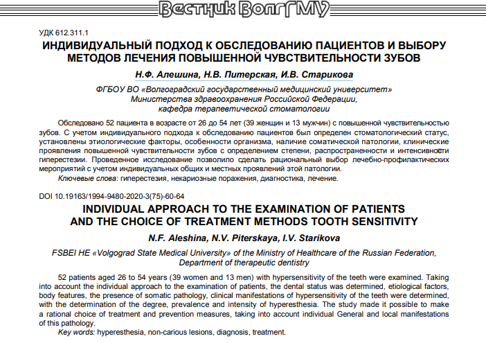 ИНДИВИДУАЛЬНЫЙ ПОДХОД К ОБСЛЕДОВАНИЮ ПАЦИЕНТОВ И ВЫБОРУ МЕТОДОВ ЛЕЧЕНИЯ ПОВЫШЕННОЙ ЧУВСТВИТЕЛЬНОСТИ ЗУБОВ