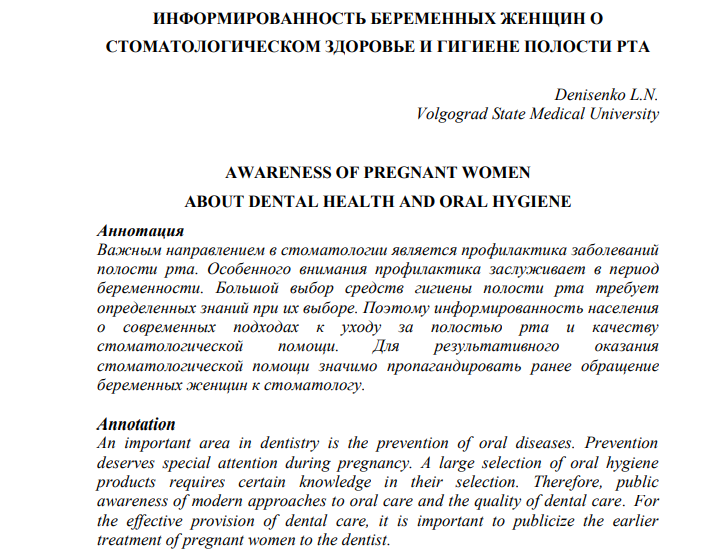 ИНФОРМИРОВАННОСТЬ БЕРЕМЕННЫХ ЖЕНЩИН О СТОМАТОЛОГИЧЕСКОМ ЗДОРОВЬЕ И ГИГИЕНЕ ПОЛОСТИ РТА