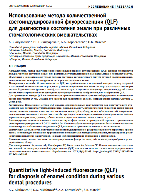 Для цитирования: Акулович АВ, Никифорова ГГ, Коростелев АА, Матело СК. Использование метода количественной светоиндуцированной флуоресценции (QLF) для диагностики состояния эмали при различных