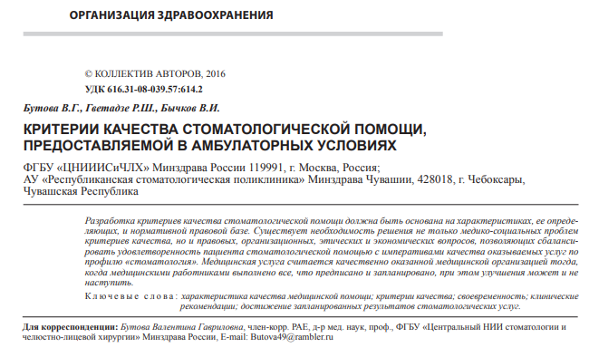 Ключевые слова: характеристика качества медицинской помощи; критерии качества; своевременность; клинические рекомендации; достижение запланированных результатов стоматологических услуг.