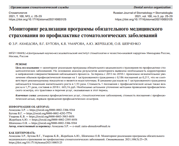 6. Шевченко О.В., Бутова В.Г. Динамика посещений с профилактической целью в системе обязательного медицинского страхования по профилю «стоматология». Стоматология. 2017;96(6):17-22.Shevchenko OV, Butova VG. Dynamics of visits with a preventive purpose in the system of compulsory medical insurance for the profile «Dentistry».Stomatologiya (Stomatology). 2017;96(6):17-22.