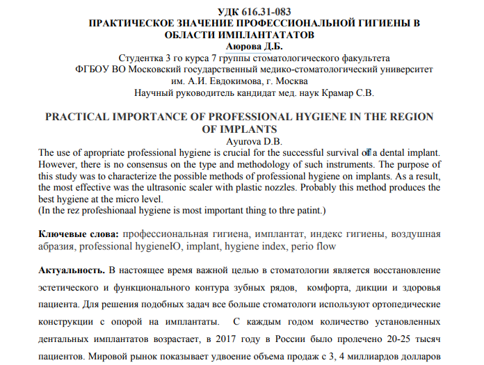 Ключевые слова: профессиональная гигиена, имплантат, индекс гигиены, воздушная абразия, professional hygieneЮ, implant, hygiene index, perio flow