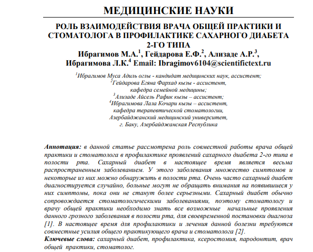 РОЛЬ ВЗАИМОДЕЙСТВИЯ ВРАЧА ОБЩЕЙ ПРАКТИКИ И СТОМАТОЛОГА В ПРОФИЛАКТИКЕ САХАРНОГО ДИАБЕТА 2-ГО ТИПА