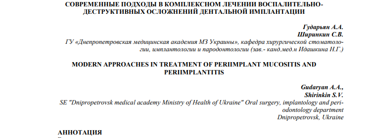 СОВРЕМЕННЫЕ ПОДХОДЫ В КОМПЛЕКСНОМ ЛЕЧЕНИИ ВОСПАЛИТЕЛЬНОДЕСТРУКТИВНЫХ ОСЛОЖНЕНИЙ ДЕНТАЛЬНОЙ ИМПЛАНТАЦИИ - библиотека стоматологического колледжа №1