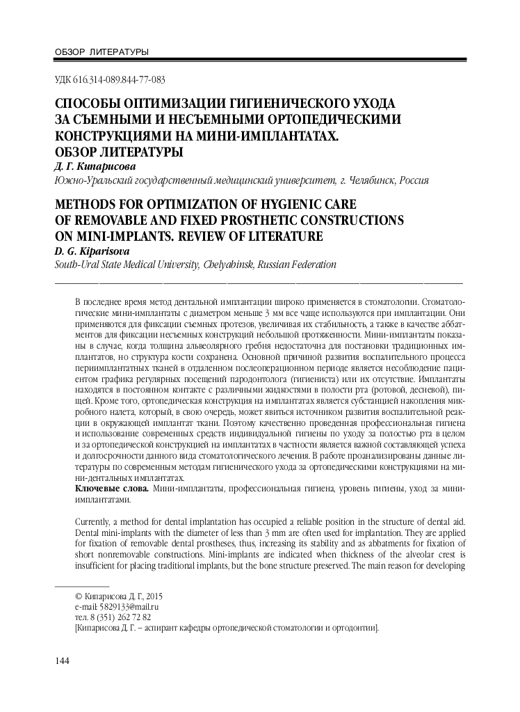 Способы оптимизации гигиенического ухода за съемными и несъемными ортопедическими конструкциями на миниjимплантатах. обзор литературы