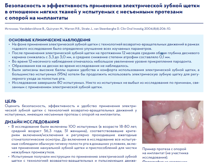 Оценить безопасность, эффективность и удобство применения электрической зубной щетки с технологией возвратно-вращательных движений у испытуемых, имеющих несъемные протезы с опорой на имплантаты.