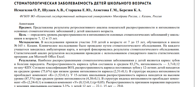 Цель исследования — определить уровень распространенности и интенсивности основных стоматологических заболеваний у 310 школьников в возрасте 7, 12 и 15 лет.