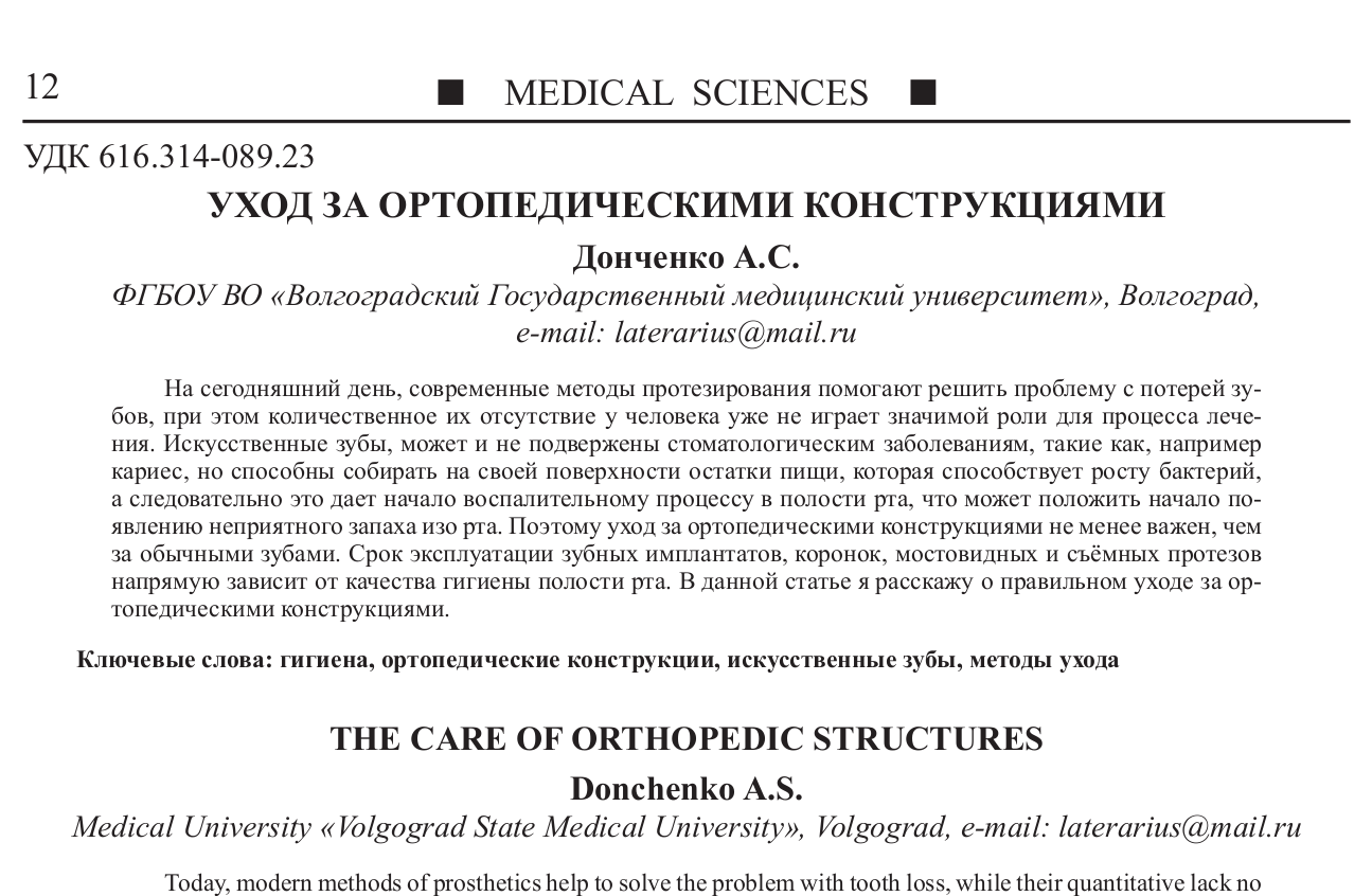 Ключевые слова: гигиена, ортопедические конструкции, искусственные зубы, методы ухода