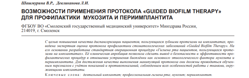 Для цитирования: Шашмурина В.Р., Девликанова Л.И. Возможности применения протокола «Guided Biofilm Therapy» для профилактики мукозита и периимплантита. Российский стоматологический журнал. 2018; 22 (5): 262-266. http://dx.doi. org/10.18821/1728-2802-2018-22-5-262-266
