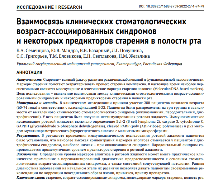 Заключение. Определение уровня маркеров апоптоза в ротовой жидкости может иметь практическое клиническое применение в персонализированной диагностике предрасположенности к основным стоматологическим возраст-ассоциированным синдромам, а также системной сопутствующей патологии. Ранняя диагностика заболеваний на начальном этапе их развития позволяет давать пациентам своевременные рекомендации по коррекции повседневного образа жизни, привычек, приему препаратов.
