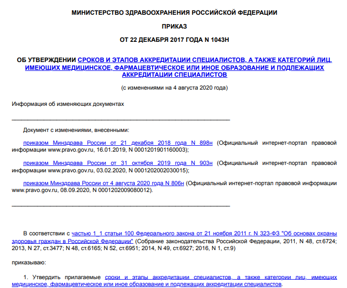 ОБ УТВЕРЖДЕНИИ СРОКОВ И ЭТАПОВ АККРЕДИТАЦИИ СПЕЦИАЛИСТОВ, А ТАКЖЕ КАТЕГОРИЙ ЛИЦ, ИМЕЮЩИХ МЕДИЦИНСКОЕ, ФАРМАЦЕВТИЧЕСКОЕ ИЛИ ИНОЕ ОБРАЗОВАНИЕ И ПОДЛЕЖАЩИХ АККРЕДИТАЦИИ СПЕЦИАЛИСТОВ (с изменениями на 4 августа 2020 года)