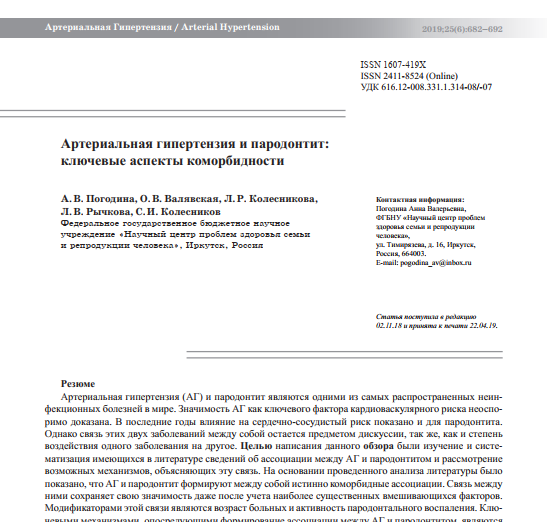 Целью написания данного обзора являются изучение и систематизация имеющихся в литературе сведений об ассоциации между АГ и пародонтитом и рассмотрение возможных механизмов, объясняющих эту связь.