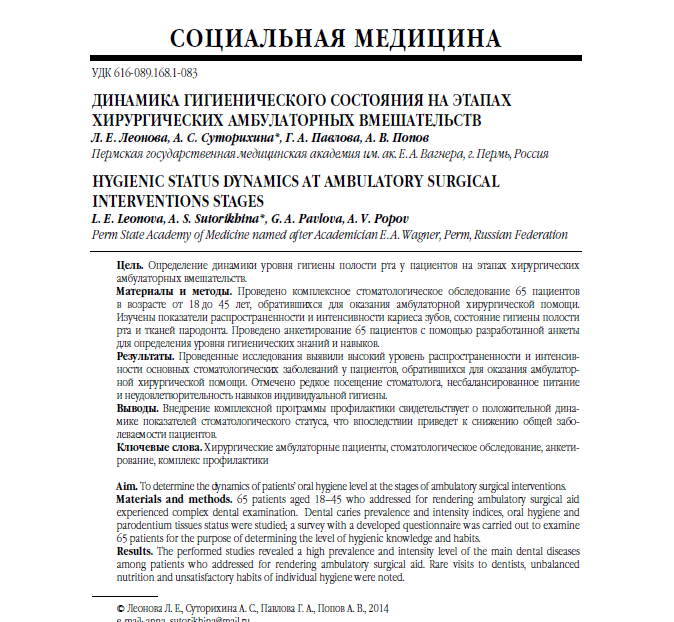 Исследования свидетельствуют о том,что уровень гигиенических знаний по уходуза полостью рта у пациентов, находящихсяна предоперационном этапе подготовкик хирургическому вмешательству, недостаточен. Так как оперативные вмешательствав полости рта проводятся в условиях повышенного риска развития воспалительныхосложнений, в целях профилактики в преди послеоперационный периоды необходимызнания по привитию навыков индивидуальной гигиены полости рта и формированиемотивации для проведения профессиональной гигиены полости рта. Внедрение комплексной программы профилактики свидетельствует о положительной динамике показателей стоматологического статуса, чтовпоследствии приведет к снижению общейзаболеваемости пациентов.