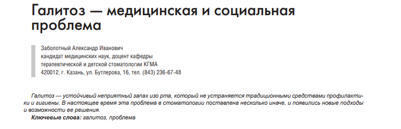 7. Исследование проявлений галитоза. — Ж. «Стоматологический журнал», 2006, том 4. — С. 310-313.