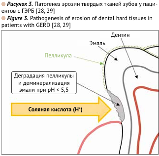 Развитие ЭТТЗ в рамках ГЭРБ происходит стадийно. Изначально под действием повторяющихся кислотных атак происходит постепенная деградация пелликулы зуба, которая в норме реализует протекцию твердых тканей зуба от воздействия кислот [27, 28]. Потеря пелликулы приводит к непосредственному контакту соляной кислоты рефлюктата с поверхностью эмали и инициации ее деминерализации при рН <5,5 с растворением кристаллов гидроксиапатита (рис. 3) [28, 29]. Глубокие ЭТТЗ приводят к открытию дентинных канальцев и развитию гиперчувствительности [12]. Слюна, содержащая бикарбонаты, противомикробные субстанции, кальций и фосфаты, является основным защитным механизмом, способным остановить деминерализацию и способствовать минерализации твердых тканей зубов [30, 31]. Вместе с тем у пациентов с ГЭРБ нередко определяется гипосаливация, особенно у лиц с ожирением, что также играет роль в генезе ЭТТЗ [31].