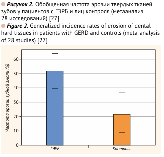 АССОЦИАТИВНЫЕ СВЯЗИ ГЭРБ И ЭРОЗИИ ТВЕРДЫХ ТКАНЕЙ ЗУБОВГЭРБ является наиболее частой причиной, индуцирующей развитие ЭТТЗ, что обусловлено ретроградным забросом в полость рта кислого желудочного содержимого [21–23]. Согласно данным нескольких систематических обзоров, частота ЭТТЗ у пациентов с ГЭРБ взрослого возраста составляет 32,5–38,96% [24, 25]. При этом в некоторых работах было отмечено, что тяжесть эрозивного поражения твердых тканей зубов у лиц с ГЭРБ выше в сравнении с лицами контроля [13, 26]. Недавно опубликованный метаанализ, проведенный нашей группой, обобщивший результаты 28 исследований с участием 4379 человек (2309 – пациенты с ГЭРБ, 2070 – лица контроля), показал, что обобщенная частота ЭТТЗ у пациентов с ГЭРБ составила 51,524% (95 ДИ 39,742–63,221), а у лиц контроля – 21,351% (95 ДИ 9,234–36,807) (рис. 2) [27]. Субанализ данных продемонстрировал, что обобщенная распространенность ЭТТЗ у пациентов с ГЭРБ в странах Европы составила 46,497% (95 ДИ 30,125–63,266),