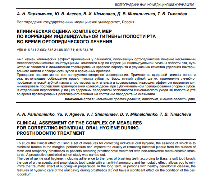 КЛИНИЧЕСКАЯ ОЦЕНКА КОМПЛЕКСА МЕР ПО КОРРЕКЦИИ ИНДИВИДУАЛЬНОЙ ГИГИЕНЫ ПОЛОСТИ РТА ВО ВРЕМЯ ОРТОПЕДИЧЕСКОГО ЛЕЧЕНИЯ