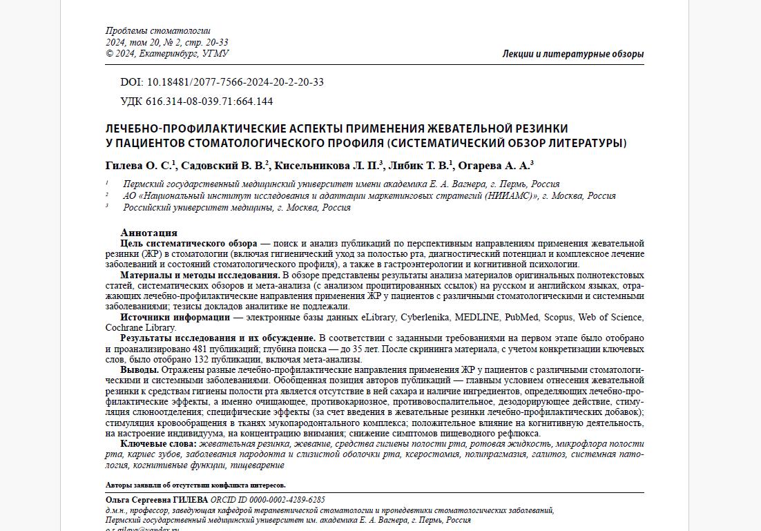 ЛЕЧЕБНО-ПРОФИЛАКТИЧЕСКИЕ АСПЕКТЫ ПРИМЕНЕНИЯ ЖЕВАТЕЛЬНОЙ РЕЗИНКИ У ПАЦИЕНТОВ СТОМАТОЛОГИЧЕСКОГО ПРОФИЛЯ (СИСТЕМАТИЧЕСКИЙ ОБЗОР ЛИТЕРАТУРЫ). Проблемы стоматологии. 2024; 2: 20-33.