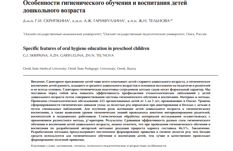 Цель исследования — повышение эффективности профилактики стоматологических заболеваний у детей дошкольного возраста путем совершенствования системы гигиенического обучения и воспитания.