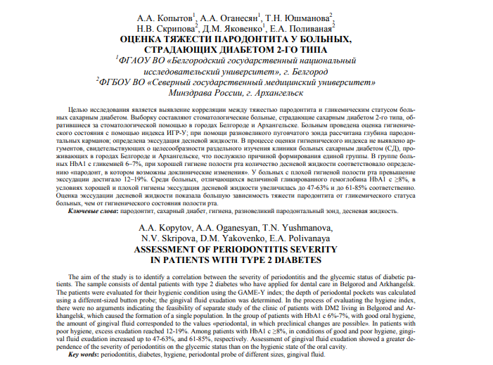 Целью исследования является выявление корреляции между тяжестью пародонтита и гликемическим статусом больных сахарным диабетом. Выборку составляют стоматологические больные, страдающие сахарным диабетом 2-го типа, обратившиеся за стоматологической помощью в городах Белгороде и Архангельске. Больным проведена оценка гигиенического состояния с помощью индекса ИГР-У; при помощи разновеликого пуговчатого зонда рассчитана глубина пародонтальных карманов; определена экссудация десневой жидкости. В процессе оценки гигиенического индекса не выявлено аргументов, свидетельствующих о целесообразности раздельного изучения клиники больных сахарным диабетом (СД), проживающих в городах Белгороде и Архангельске, что послужило причиной формирования единой группы. В группе больных HbA1 c гликемией 6–7%, при хорошей гигиене полости рта количество десневой жидкости соответствовало определению «пародонт, в котором возможны доклинические изменения». У больных с плохой гигиеной полости рта превышение экссудации достигало 12–19%. Среди больных, отличающихся величиной гликированного гемоглобина HbA1 c ≥8%, в условиях хорошей и плохой гигиены экссудация десневой жидкости увеличилась до 47-63% и до 61-85% соответственно. Оценка экссудации десневой жидкости показала большую зависимость тяжести пародонтита от гликемического статуса больных, чем от гигиенического состояния полости рта.