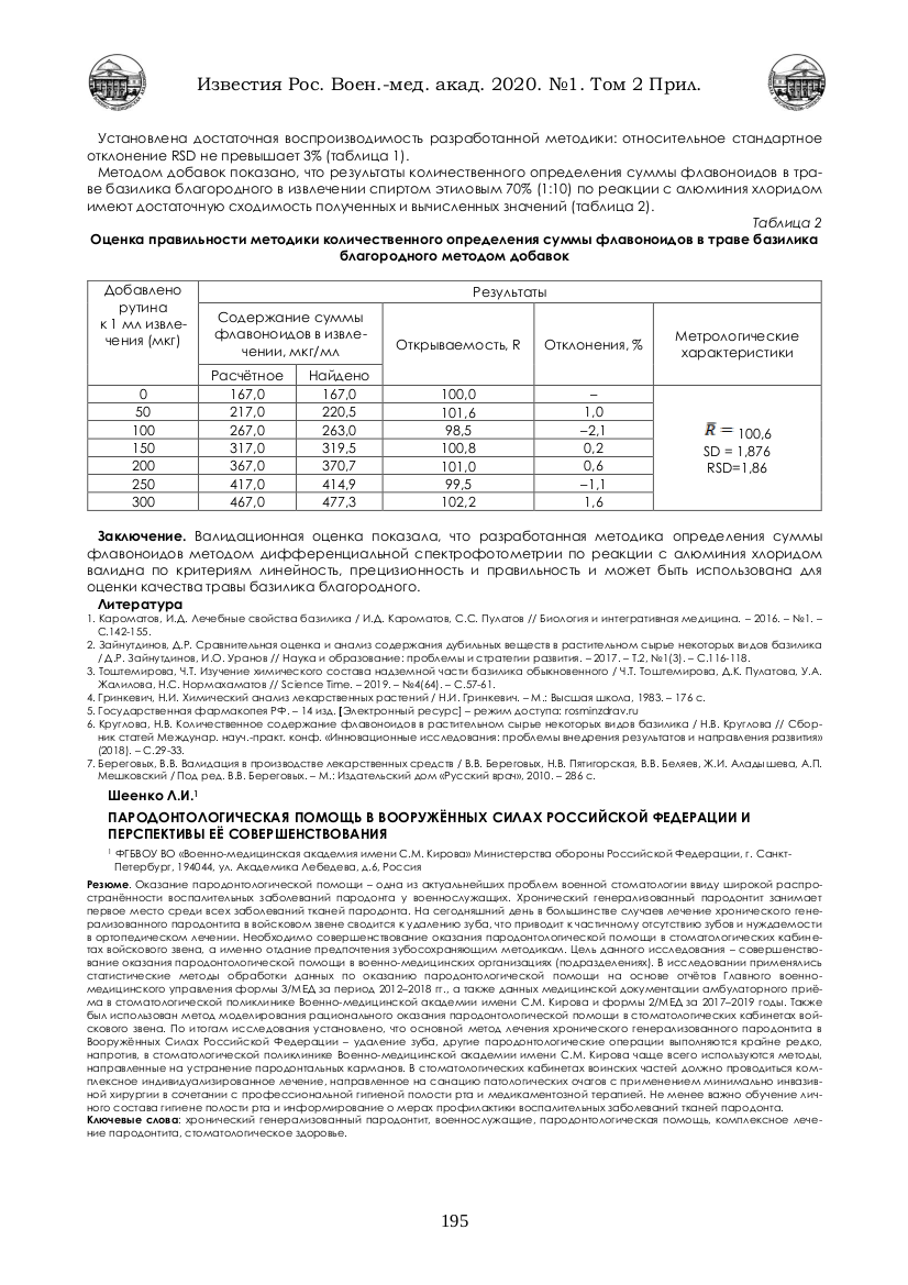 - Шеенко, Л.И. Мини-инвазивные методы лечения хронического генерализованного пародонтита у военнослужащих / Л.И. Шеенко // Известия Российской Военно-медицинской академии. – 2019. – Т.38, No1, прил.1 (часть 3). – С.167-170.