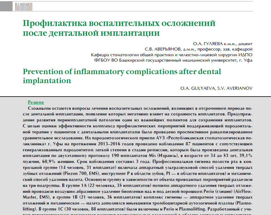 Исследования последних лет свидетельствуют о том, что от 50% до 70% пациентов с дентальными имплантата ми страдают заболеваниями пародонта, что в отдаленном послеоперационном периоде может являться причиной потери зубов. Поэтому пациенты с протезами на денталь ных имплантатах нуждаются в регулярном наблюдении не только хирургаимплантолога, но и пародонтолога, а также в соблюдении качественной гигиены полости рта для пре дотвращения развития таких осложнений, как периимплан татный мукозит и периимплантит [2]. Известно, что несмо тря на выполнение всех рекомендаций по рациональному гигиеническому уходу после дентальной имплантации, не всегда удается поддерживать удовлетворительный уровень гигиены полости рта, особенно у больных с патологией тканей пародонта, обусловленное тем, что наличие воспа лительного или воспалительнодеструктивного процесса в пародонте требует другого объема и другой кратности проводимых лечебнопрофилактических мероприятий [11].