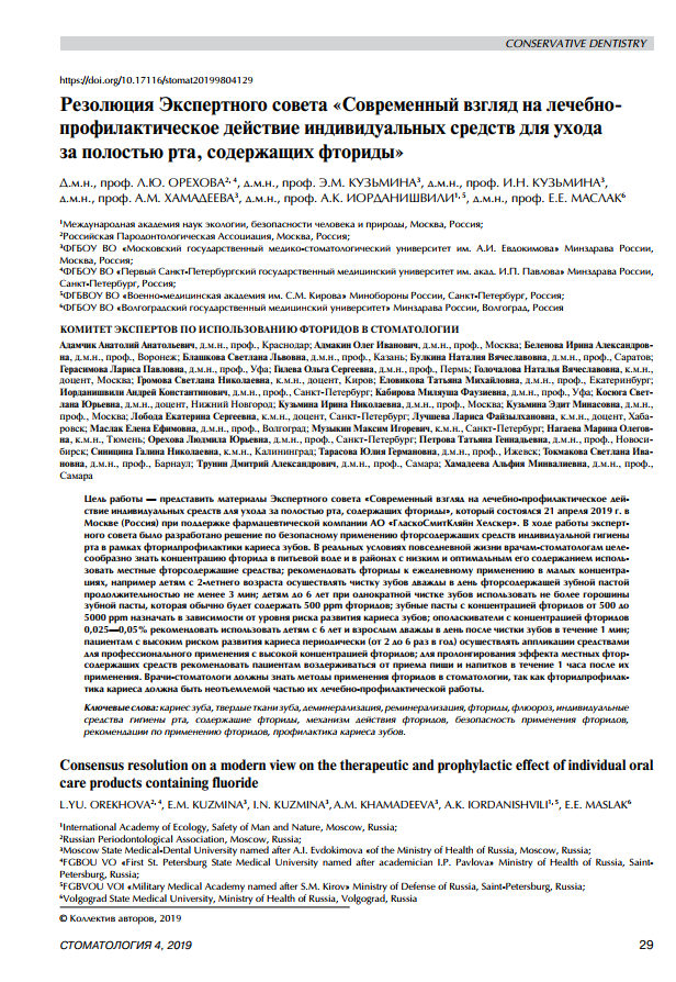 Конфликт интересов. Экспертный совет «Современный взгляд на лечебно-профилактическое действие индивидуальных средств для ухода за полостью рта, содержащих фториды» был проведен 21 апреля 2019 г. в Москве (Россия) Российской Пародонтологической Ассоциацией при поддержке Стоматологической Ассоциации России и спонсорской поддержке компании АО "ГлаксоСмитКляйн Хелскер". Компания АО "ГлаксоСмитКляйн Хелскер" не осуществляла редакторский контроль.