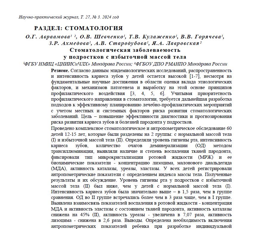 (I) и избыточной массой тела (II). Определяли уровень гигиены рта, интенсивность кариеса зубов, количество очагов деминерализации (ОД) методом трансиллюминации, выявляли наличие и степень воспаления тканей пародонта, фиксировали тип микрокристализации ротовой жидкости (МРЖ) и ее биохимические показатели — концентрацию лизоцима, малонового диальдегида (МДА), активность каталазы, уреазы, эластазы. У всех детей регистрировали антропометрические показатели с определением индекса массы тела. Полученные результаты и их обсуждение. Уровень гигиены рта у подростков с избыточной массой тела (II) был ниже, чем у детей с нормальной массой тела (I). Интенсивность кариеса зубов была значительно выше – в 1,5 раза, чем в группе сравнения. ОД во II группе встречались более чем в 3 раза чаще, чем в I группе. Выявлена взаимосвязь показателей воспаления в ротовой жидкости — концентрация МДА и активность эластазы с состоянием тканей пародонта, активность каталазы снижена на 45% (II), активность уреазы — увеличена в 7,07 раза, активность лизоцима — снижена в 2,6 раза. Выводы. Определена необходимость включения антропометрических показателей ребенка при разработке индивидуальной программы профилактики основных стоматологических заболеваний.
