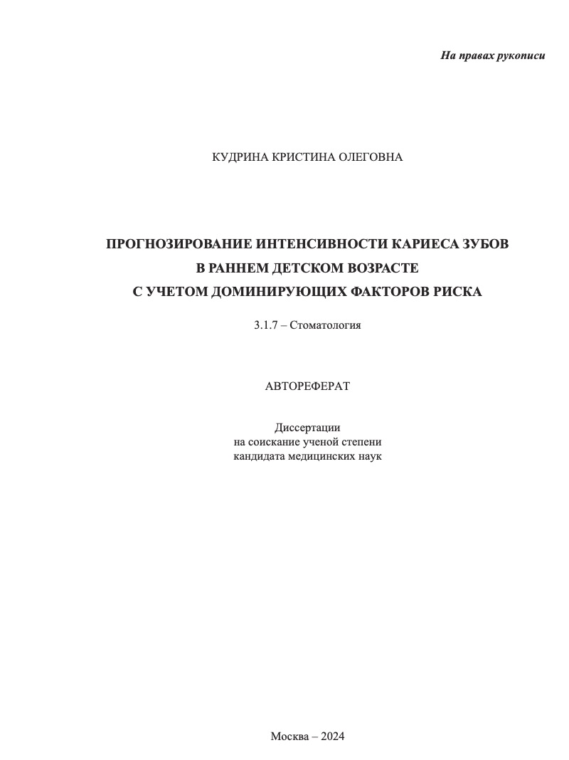 Кудрина К.О. Прогнозирование интенсивности кариеса зубов в раннем детском возрасте с учетом доминирующих факторов риска - библиотека стоматологического колледжа №1